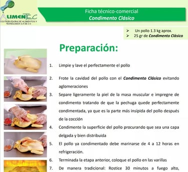 Rendimiento: Un pollo 1.3 kg aprox. = 25 gr de Condimento clásico.